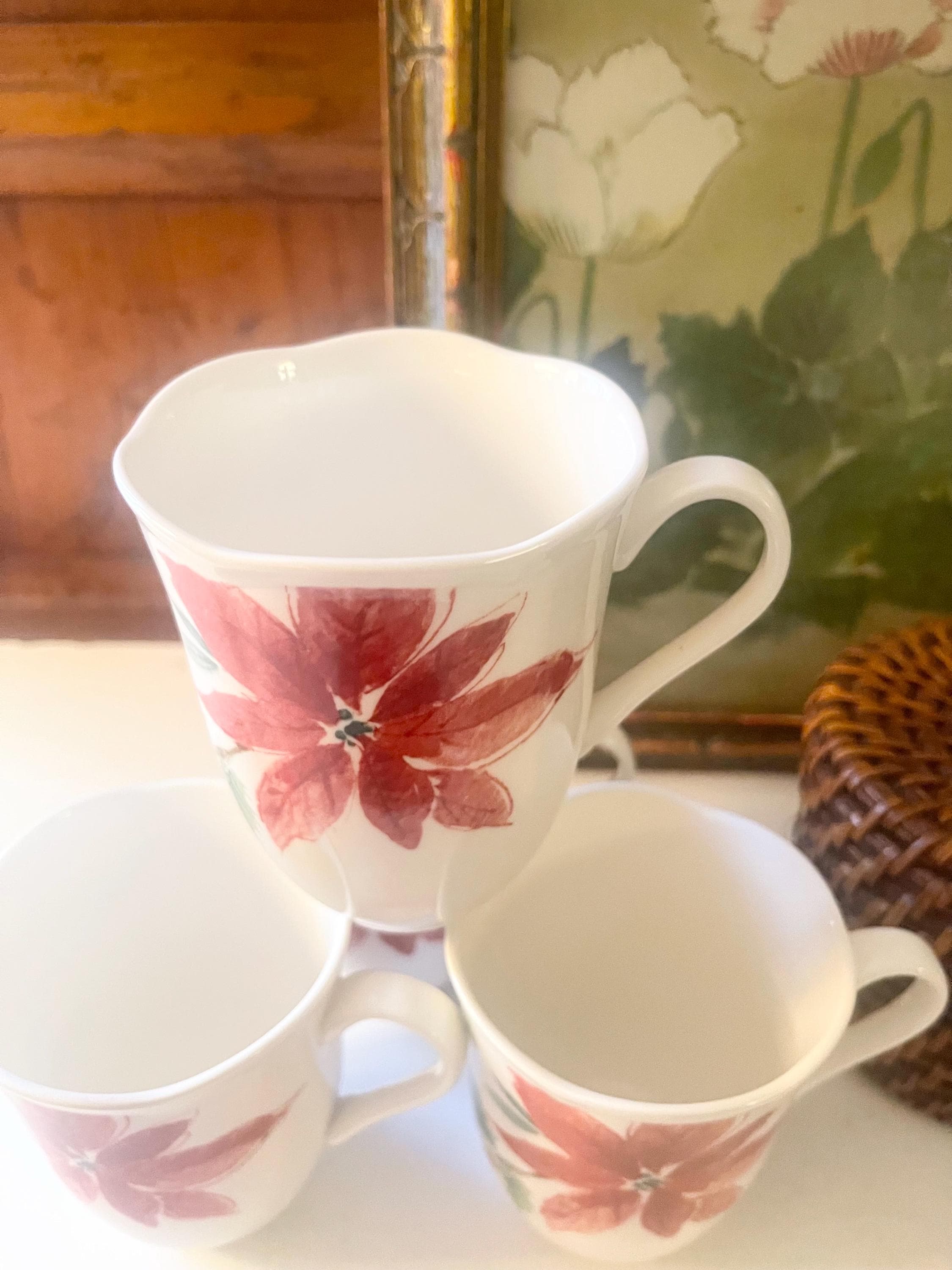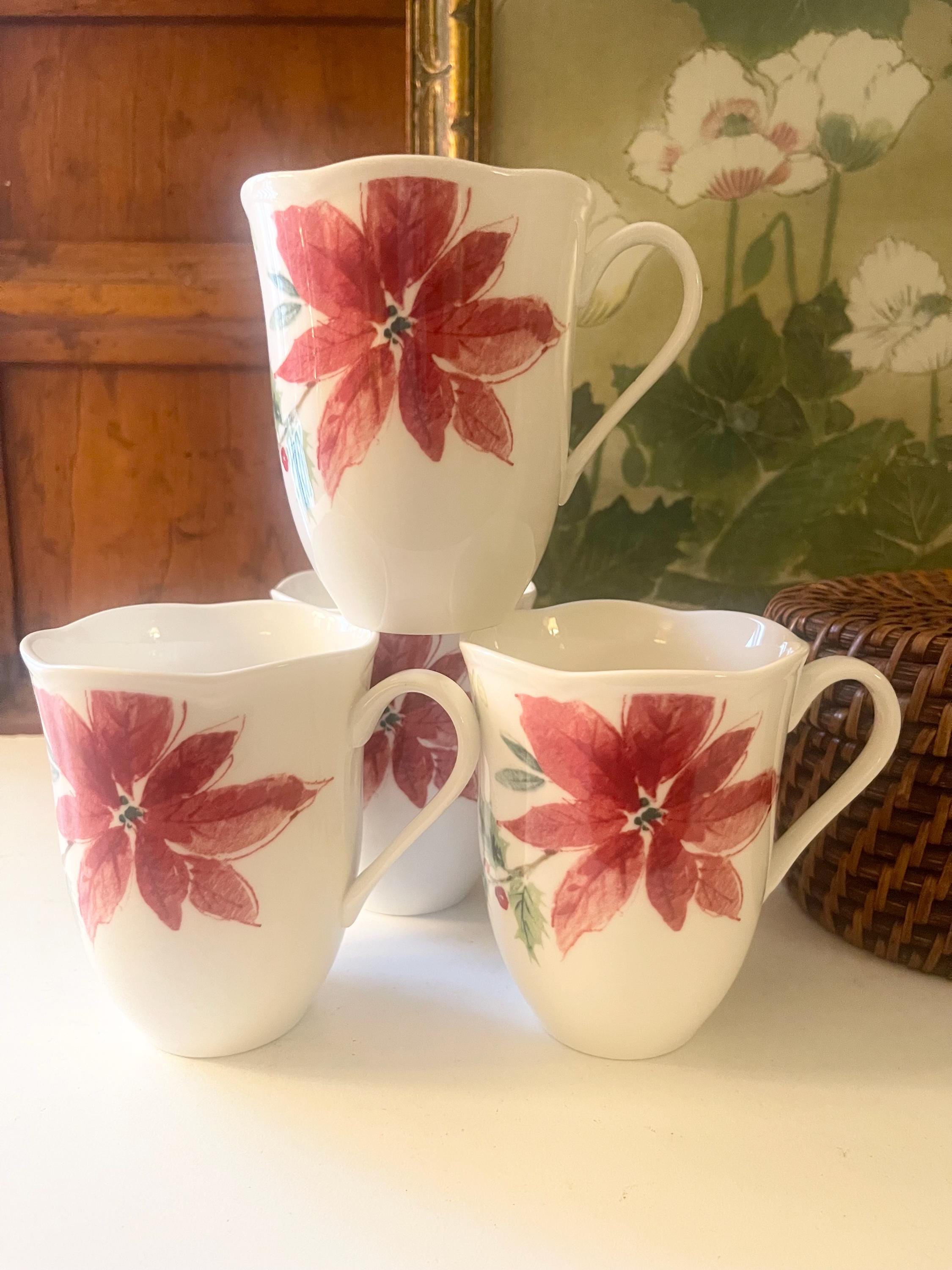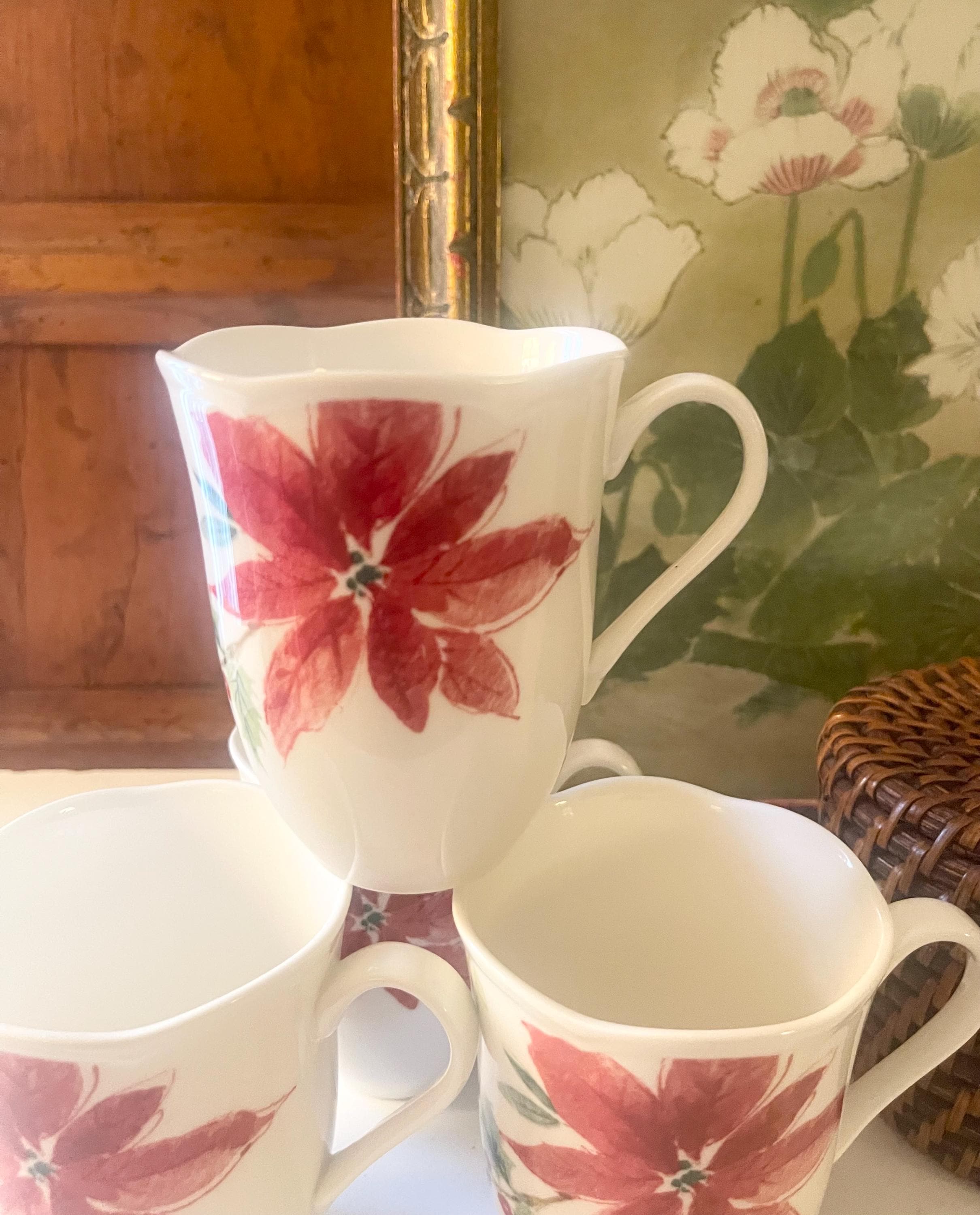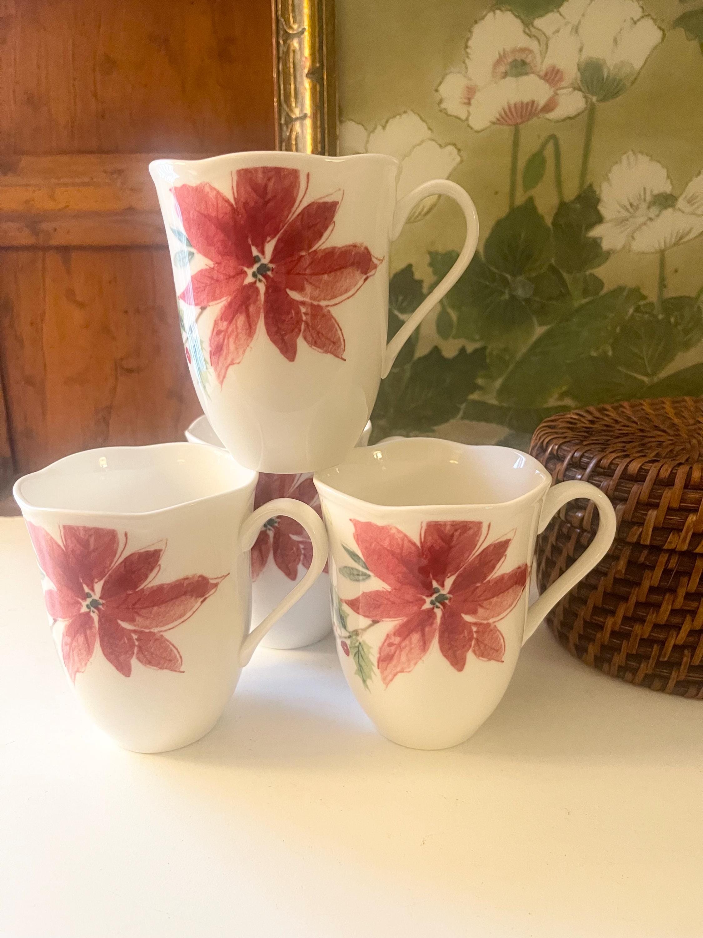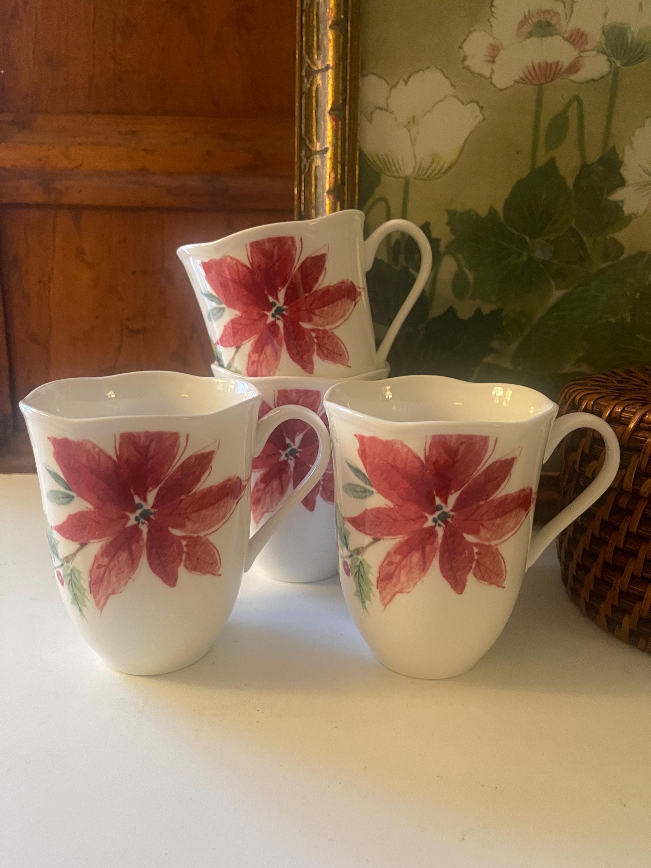 Holiday mugs feature poinsettia flower. All four mugs are identical.