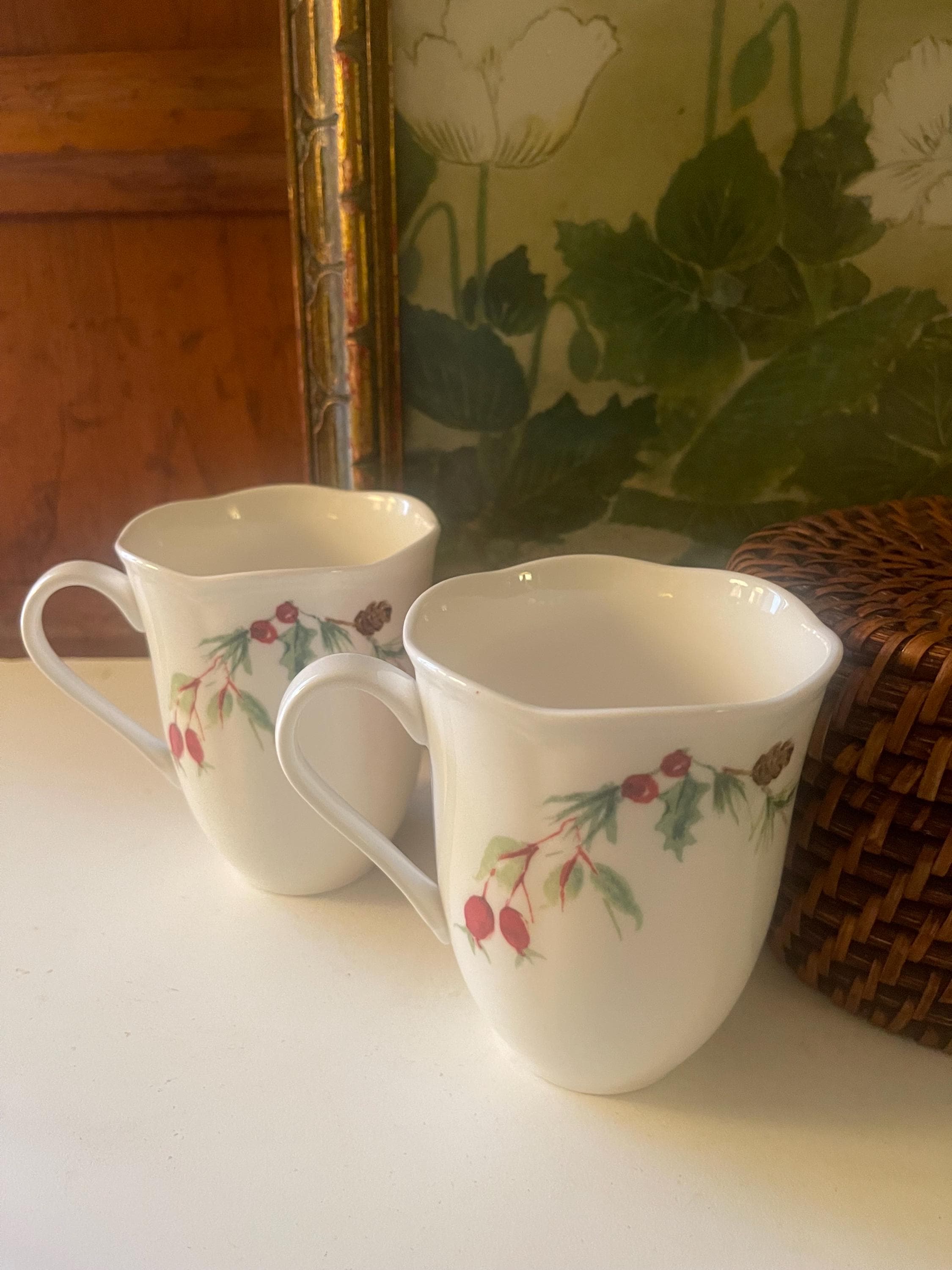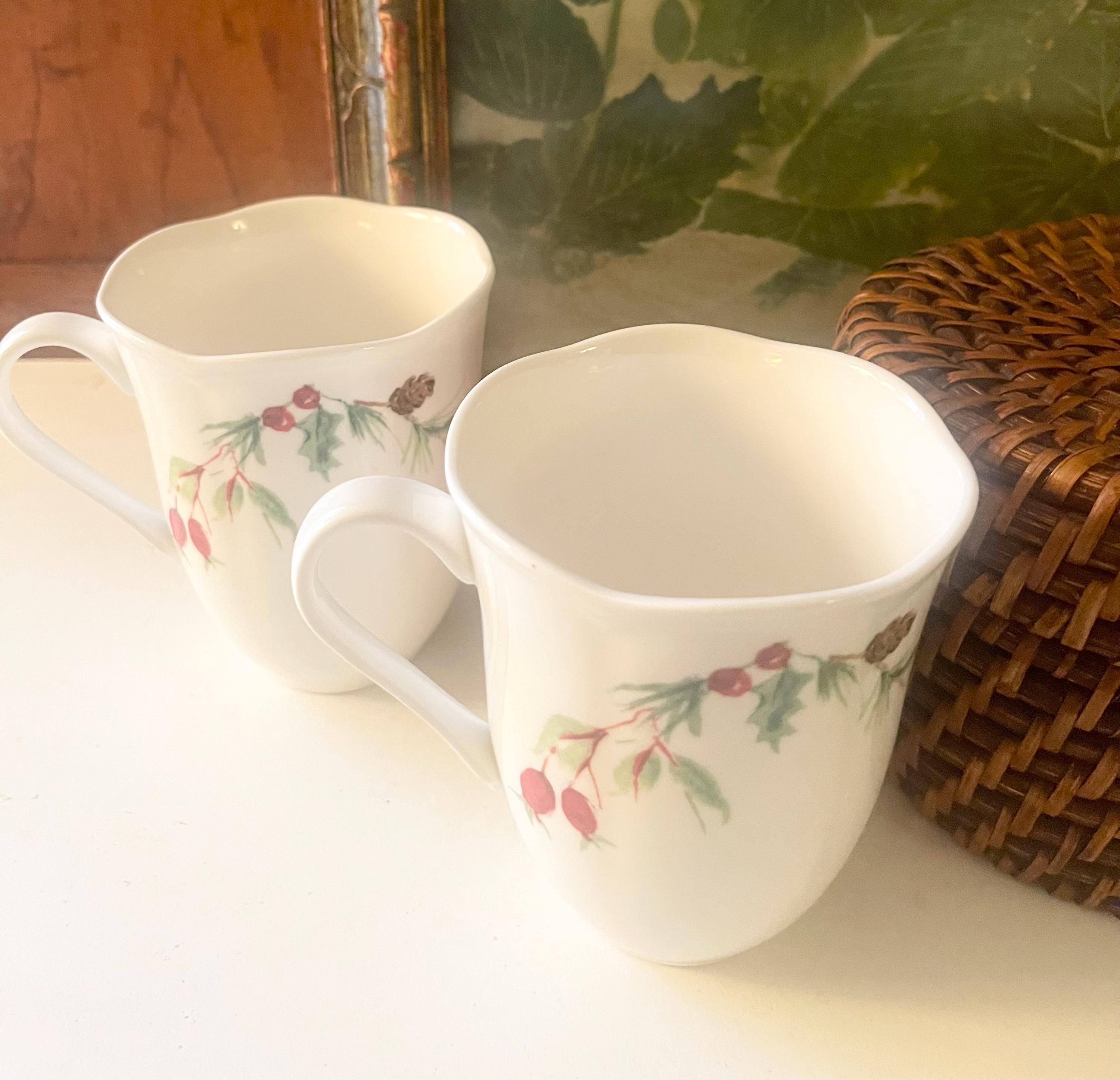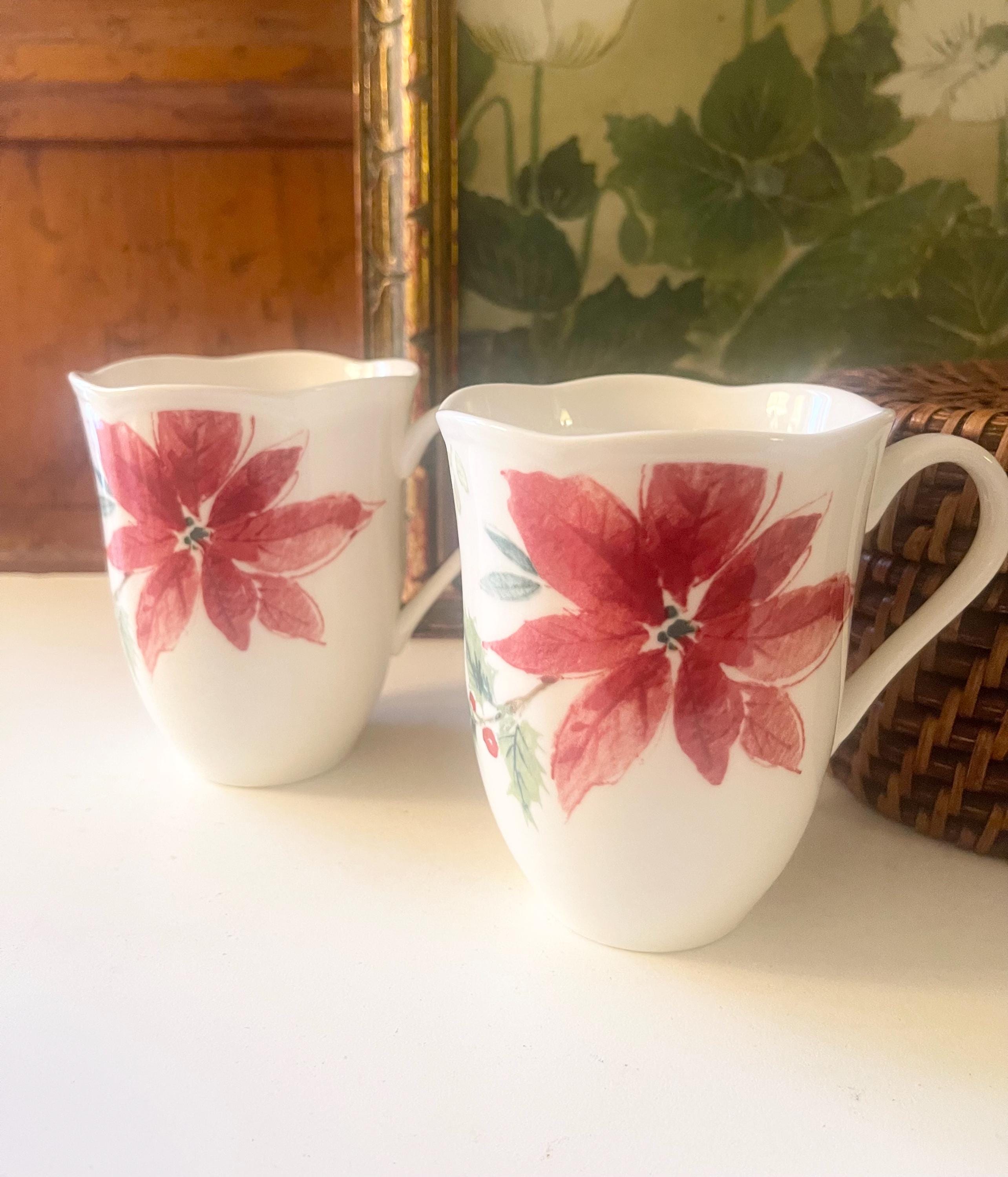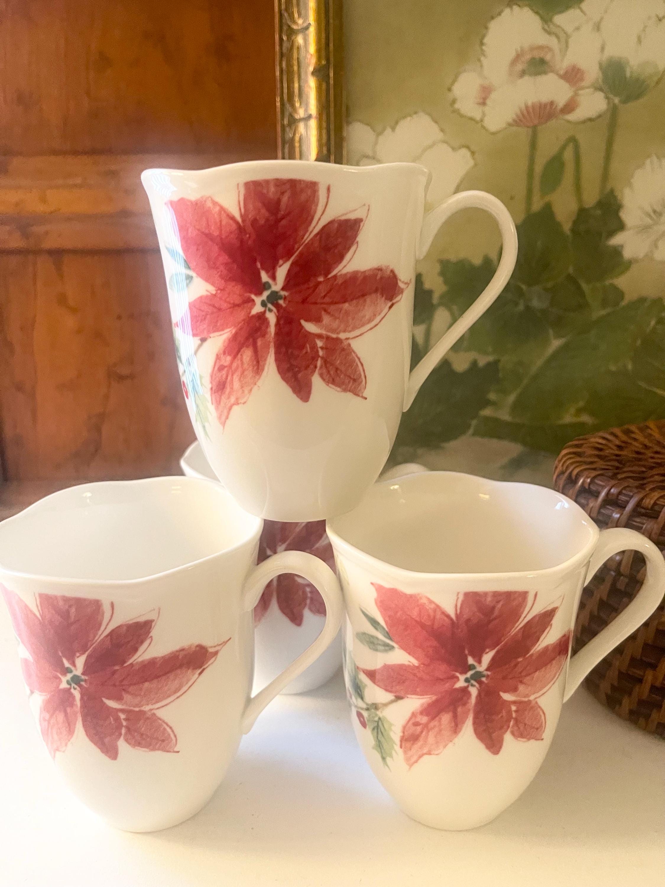 Holiday mugs feature poinsettia flower. All four mugs are identical.