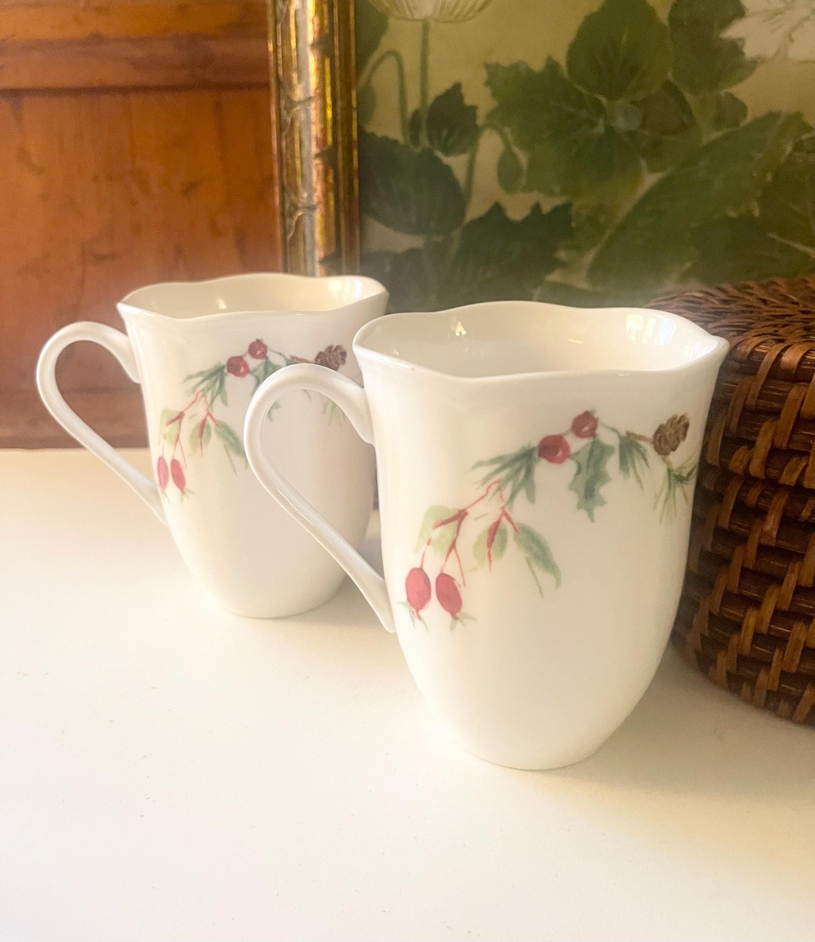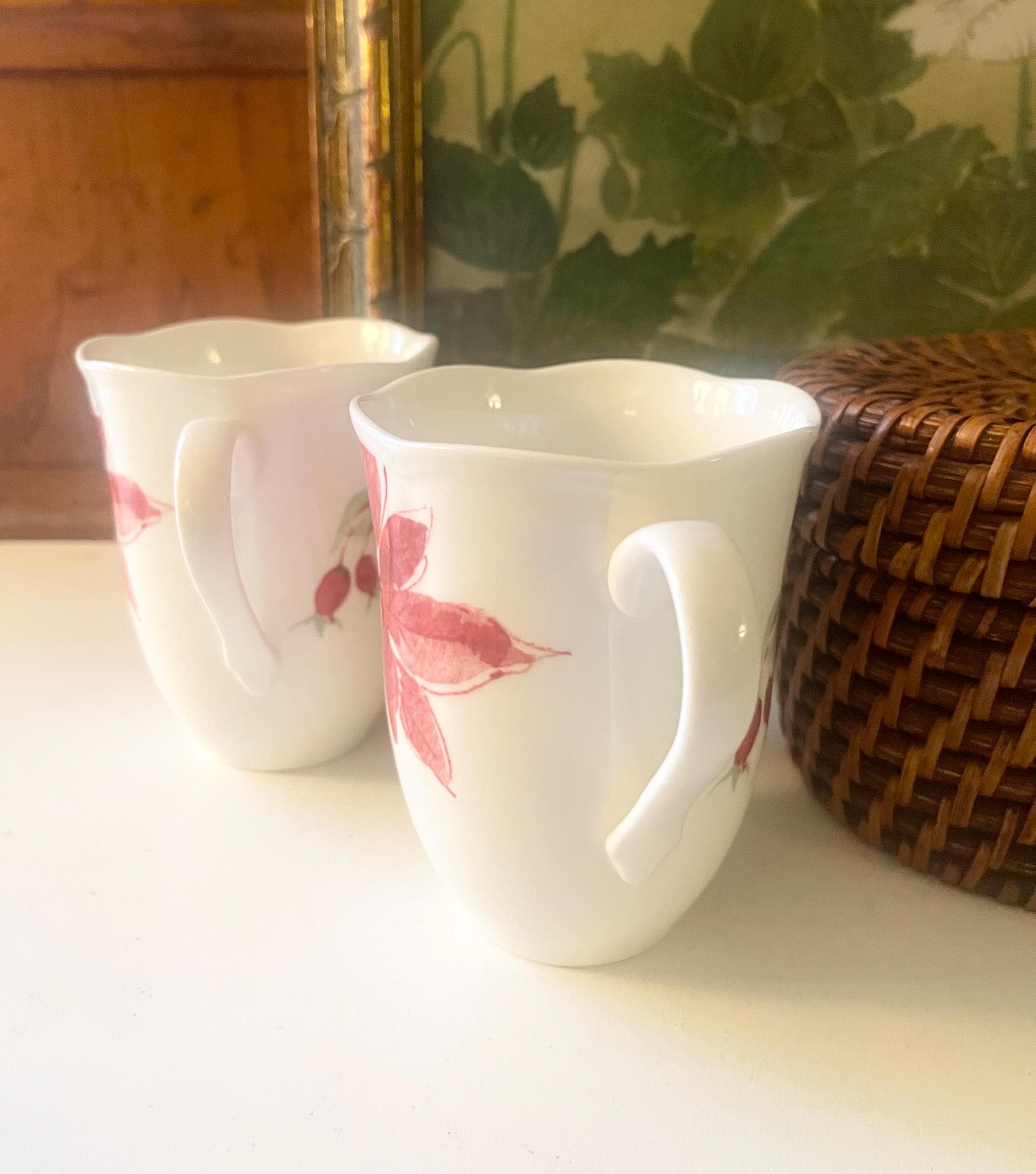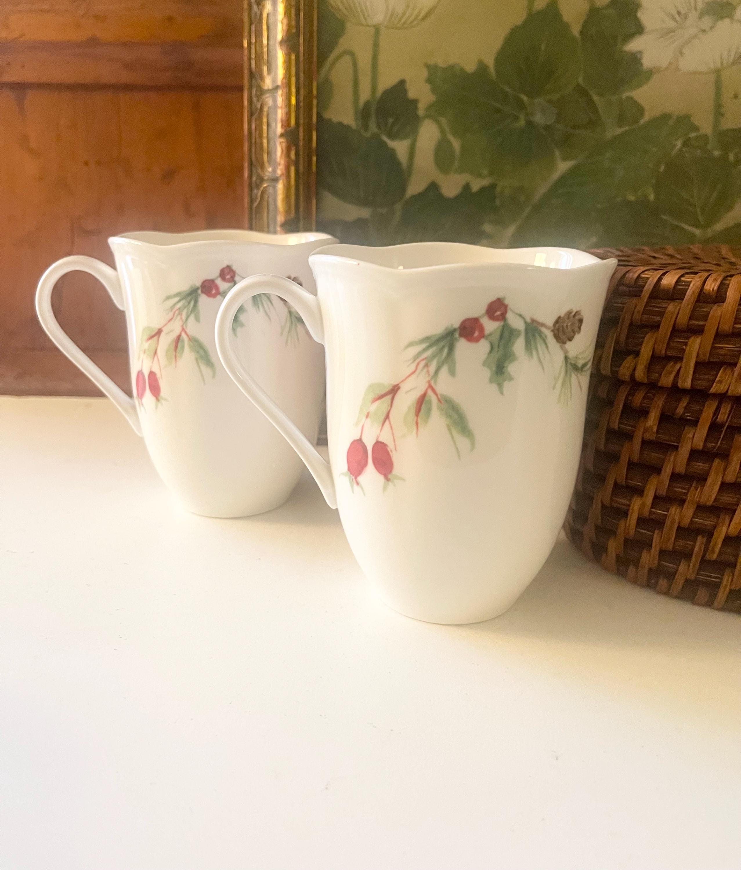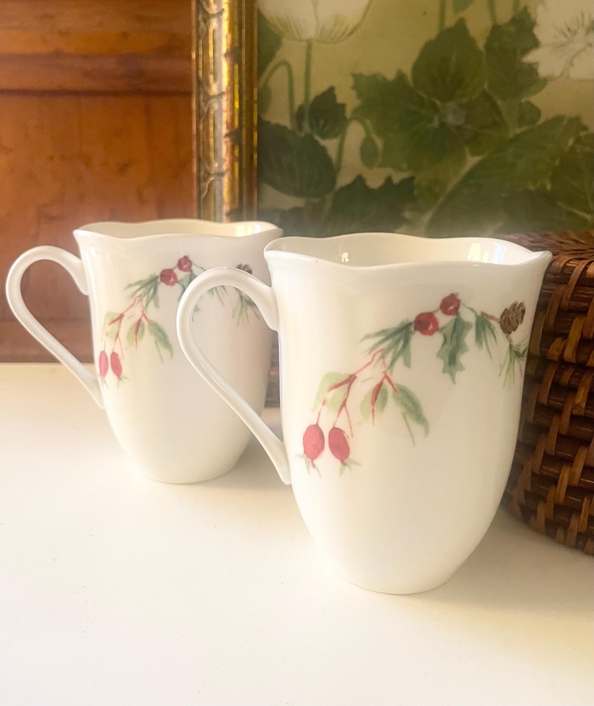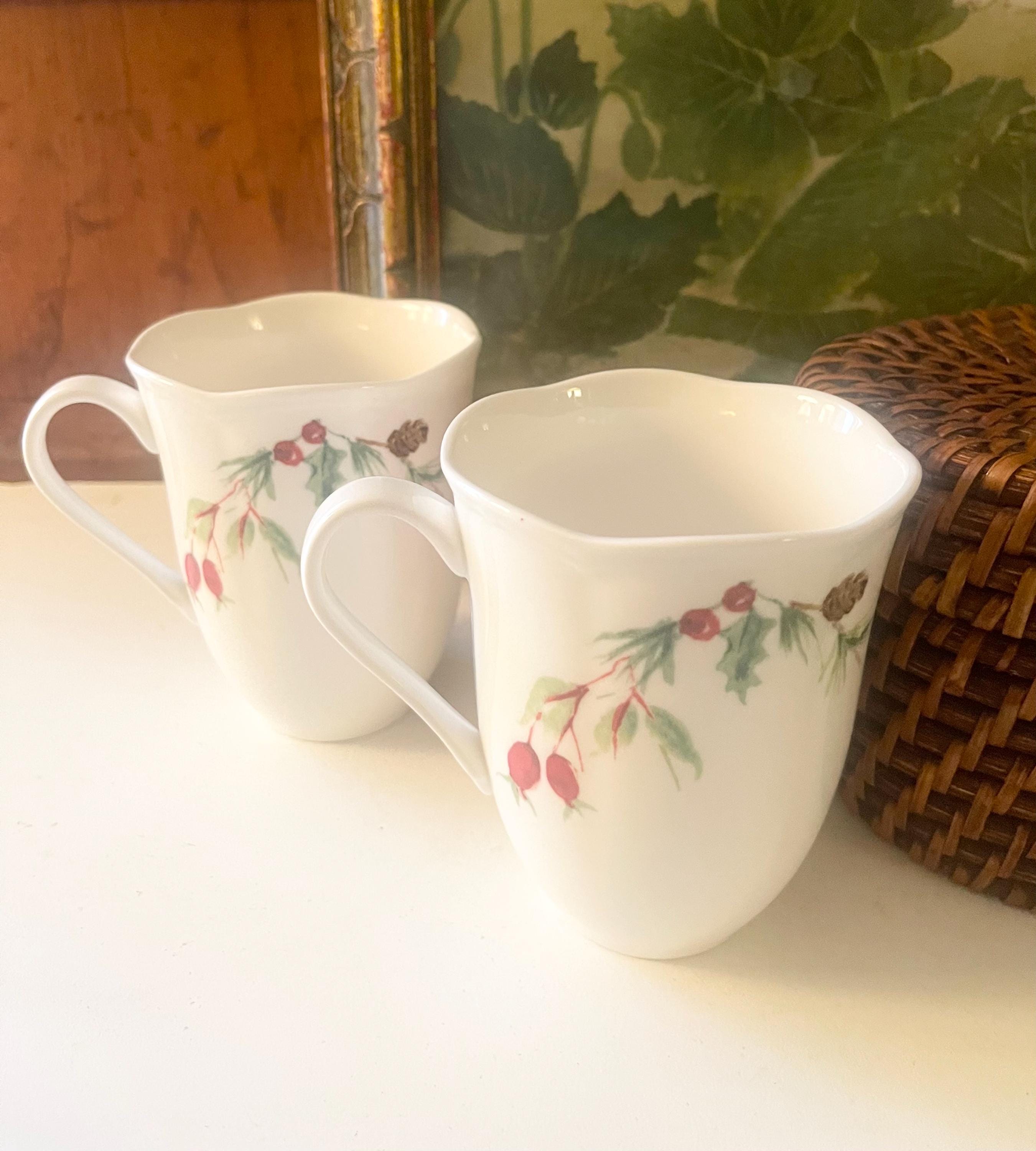 Holiday mugs feature poinsettia flower. All four mugs are identical.